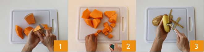 Pour préparer la purée de potiron, commencez par le nettoyer pour obtenir 700 g de pulpe. Coupez-le en tranches et retirez la peau 1, réduisez-le en cubes 2. Faites de même avec les pommes de terre en les épluchant d'abord 3