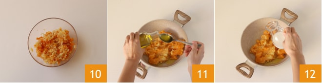 et obtenez une purée 10. Transférez dans une casserole et ajoutez l'huile 11, le lait 12,