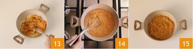 et ajoutez ensuite de la cannelle, du sel et du poivre 13. À ce moment-là, placez sur le feu à feu doux et mélangez avec un fouet pendant quelques minutes, pour que le mélange soit homogène et crémeux 14. Éteignez et dégustez la purée de potiron bien chaude 15.