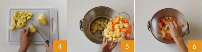 et en les coupant ensuite en cubes 4. Versez le potiron et les pommes de terre dans un cuiseur vapeur 5, placez dans une casserole avec de l'eau bouillante et couvrez avec le couvercle 6.