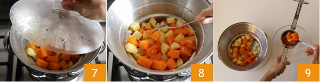 Les cubes cuiront en environ 40 minutes 7, mais faites le test avec une fourchette pour vous assurer qu'ils soient tendres 8. Transférez le tout dans un presse-purée 9