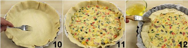 Sortez la pâte brisée du réfrigérateur, étalez-la avec un rouleau à pâtisserie en une fine abaisse et placez-la dans un moule (ou un plat à tarte) : assurez-vous, avec la pâte, de couvrir également les bords latéraux du moule. Préchauffez le four à 180°. Piquez le fond de la pâte brisée avec une fourchette 10 et remplissez avec le mélange précédemment obtenu 11 ; avec l'aide d'une spatule, nivelez le mélange puis rabattez les bords de pâte non couverts par la garniture pour former une bordure tout autour de la quiche, que vous badigeonnerez avec du blanc d'œuf 12. Enfournez la quiche aux légumes et lardons pendant 50 minutes et servez-la tiède!