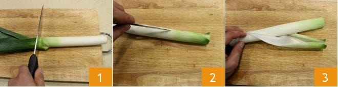 Pour préparer la quiche aux coquilles Saint-Jacques et poireaux, commencez par nettoyer les poireaux. Éliminez la partie verte 1, puis incisez la surface avec la lame d'un couteau 2, enlevez la couche extérieure 3 et enfin coupez-les en fines rondelles 4.