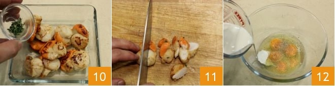 Une fois la cuisson terminée, laissez tiédir les mollusques dans un bol et assaisonnez-les en ajoutant du thym 10. Après avoir grossièrement découpé les coquilles Saint-Jacques 11, mettez-les de côté. Dans un bol, versez les quatre œufs et le jaune d'œuf, le sel, le poivre et la crème fraîche 12.