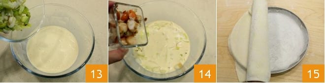Ajoutez maintenant dans le mélange liquide les poireaux 13 et les mollusques 14. Tapissez un moule de 28cm de diamètre avec du papier sulfurisé et déroulez la pâte en veillant à bien faire adhérer le fond 15.