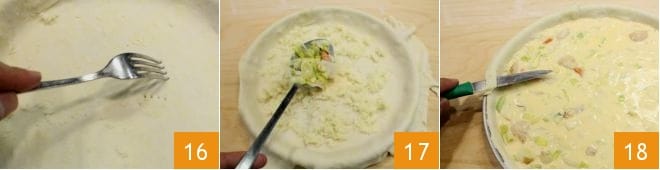 Piquez la pâte avec les dents d'une fourchette 16. Vous pouvez maintenant garnir la pâte : répartissez l'Emmental râpé au fond et versez dessus le mélange de crème, œufs, poireaux et coquilles Saint-Jacques 17. Coupez l'excès de pâte avec un couteau en retirant le bord du moule 18.