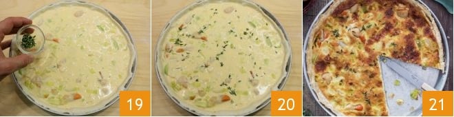 Répartissez sur la surface une autre pincée de thym 19 et enfournez la quiche terminée 20 dans un four statique préchauffé à 180°C pendant environ 35 minutes (four ventilé à 160°C pendant environ 25 minutes). Une fois cuite, sortez votre quiche aux coquilles Saint-Jacques et poireaux et laissez-la refroidir avant de la servir 21.
