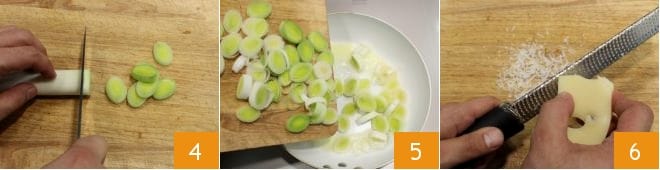 Après avoir fait fondre dans une poêle antiadhésive la moitié de la dose de beurre avec un peu d'huile, faites revenir à feu doux les rondelles de poireaux pendant environ 15 minutes jusqu'à ce qu'elles soient bien tendres 5. Une fois la cuisson terminée, mettez les poireaux de côté et râpez l'Emmental ; mettez-le de côté également 6