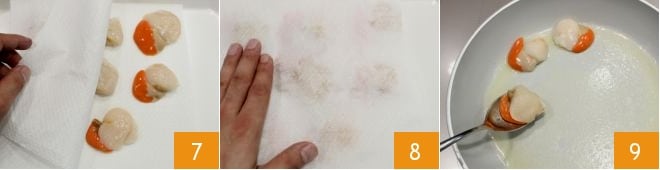 À ce stade, vous pouvez préparer les coquilles Saint-Jacques. Disposez-les sur une plaque et couvrez-les d'une feuille de papier absorbant 7, tamponnez délicatement pour éliminer l'excès d'eau 8. Faites fondre le reste du beurre dans la poêle où vous avez cuit les poireaux et faites revenir les coquilles Saint-Jacques pendant quelques minutes en les retournant avec une cuillère en bois de temps en temps 9 ; ajustez le sel.