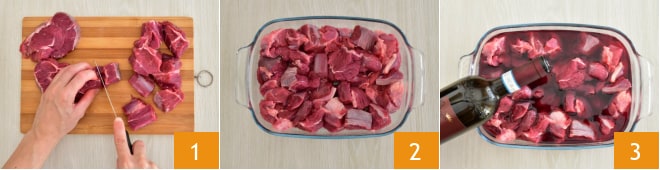 Pour réaliser le ragoût à l'Aglianico, commencez par couper grossièrement la viande en morceaux 1, puis placez-la dans un plat 2 et couvrez-la de vin 3.