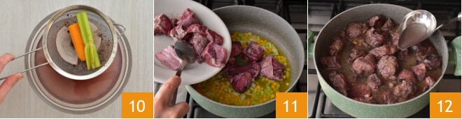 Filtrez le bouillon 10 et gardez-le au chaud. Versez maintenant le soffritto dans une grande casserole, faites-le mijoter pendant 2 minutes avec un filet d'huile, puis ajoutez la viande 11 et laissez-la dorer de tous côtés pendant environ 7 minutes. À ce point, ajoutez le bouillon 12.