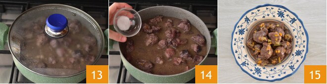 Couvrez avec un couvercle 13 et faites cuire pendant 2 heures à feu doux. Une fois la cuisson terminée, rectifiez l'assaisonnement en sel 14 et servez le ragoût à l'Aglianico bien chaud 15.