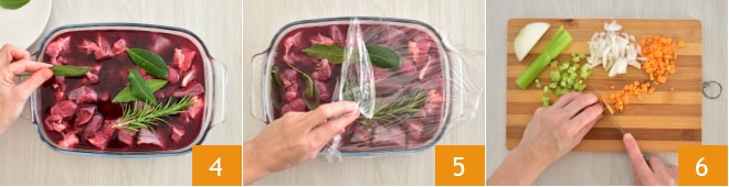 Assaisonnez avec du laurier, de la sauge et du romarin 4, couvrez avec du film alimentaire 5 et laissez mariner la viande toute la nuit au réfrigérateur. Le lendemain, poursuivez la préparation : préparez le soffritto en hachant finement l'oignon, la carotte et le céleri 6 et réservez.