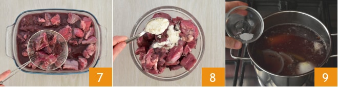 Égouttez la viande en conservant la marinade 7. Farinez les morceaux 8 puis préparez le bouillon en mettant dans une casserole la marinade réservée, l'eau, les clous de girofle, la demi-oignon, la demi-carotte et le céleri. Salez 9 et faites cuire pendant 10 minutes.