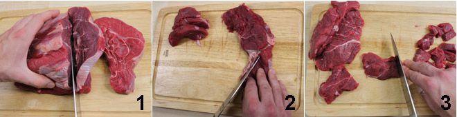 Pour préparer le ragoût à la Guinness, prenez un gros morceau de viande et coupez-le en tranches d'environ 2 cm d'épaisseur 1, éliminez les parties grasses 2 et coupez-les ensuite en cubes d'environ 2 cm 3.