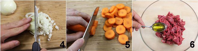 Nettoyez et épluchez les oignons et hachez-les grossièrement 4, nettoyez et épluchez les carottes et coupez-les en rondelles d'un demi-centimètre d'épaisseur 5. Placez la viande dans un grand bol et ajoutez 2 cuillères à soupe d'huile 6