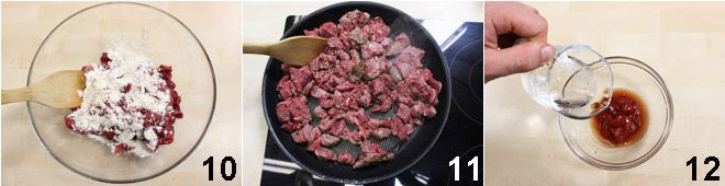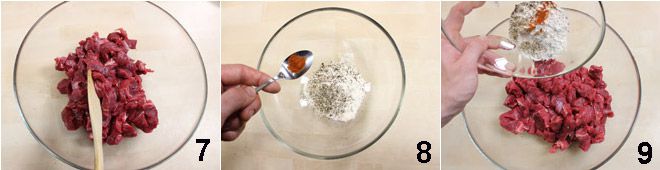 en mélangeant bien pour que toute la viande absorbe bien l'huile 7. Dans un autre bol, mettez la farine tamisée avec le sel, le poivre et le paprika 8. Ajoutez la farine ainsi aromatisée à la viande et mélangez bien pour que toute la viande soit bien farinée (9-10).