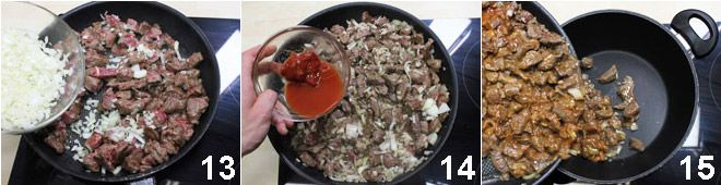 Faites chauffer ensuite quelques cuillères à soupe d'huile dans une casserole antiadhésive, dès que l'huile est chaude, ajoutez la viande, faites-la dorer pendant au moins 15 minutes à feu vif, en la retournant de temps en temps 11. Diluez le concentré de tomate avec environ 100 ml d'eau chaude 12.
