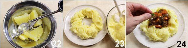 Faites bouillir les pommes de terre, épluchez-les et mettez-les dans un moulin à légumes encore chaudes, salez la purée obtenue et disposez-la dans l'assiette, en créant un cercle dans lequel vous verserez le ragoût à la Guinness.