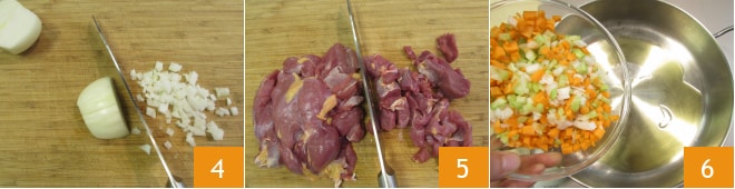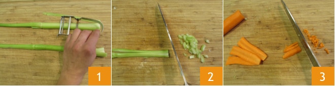 Pour préparer le ragoût de canard, commençons par le bouillon de légumes : gardez-le au chaud. Ensuite, passez au hachis de légumes. Enlevez les filaments du céleri avec un économe ou une lame lisse, 1 puis hachez-le finement 2. Continuez en nettoyant et en coupant les carottes 3