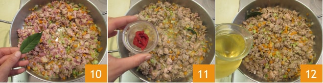 Ajoutez le laurier 10, le concentré de tomate et déglacez avec le vin 12.