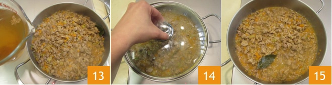 Lorsque la partie alcoolique est évaporée, mouillez avec le bouillon de légumes chaud 13. Salez et poivrez, couvrez avec le couvercle et laissez cuire à feu doux pendant environ 70 minutes : n'oubliez pas de mélanger de temps en temps et d'ajouter du bouillon si nécessaire 14. Une fois le ragoût de canard prêt, il ne vous reste plus qu'à le déguster 15 !