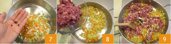 Ajoutez les baies de genièvre écrasées avec le dos d'un couteau 7 et ajoutez la viande de canard, saisissez-la encore quelques minutes 8 en mélangeant de temps en temps 9.