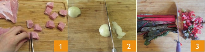 Pour préparer le ragoût de porc aux lentilles épicées, commencez par couper le filet de porc en cubes d'environ 2,5 cm 1, puis émincez finement l'oignon 2 et coupez les herbes en petits morceaux 3.