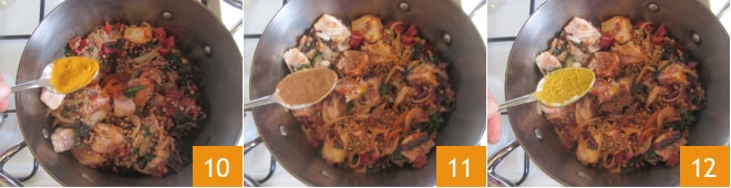 Ajoutez également le curcuma 10, la cannelle 11 et le curry 12.