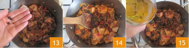 Ajoutez les baies de genièvre 13 et mélangez bien 14, puis couvrez avec la bière 15.