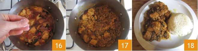 Salez 16 et laissez cuire à feu doux pendant environ une heure : la consistance doit être moelleuse mais pas liquide 17. Servez votre ragoût de porc aux lentilles épicées accompagné de riz basmati 18 !