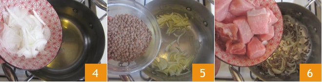 Versez un filet d'huile dans une casserole, ajoutez les oignons 4 et faites-les revenir à feu doux jusqu'à ce qu'ils soient fondus, en remuant souvent. À ce stade, ajoutez les lentilles 5 et faites-les griller quelques secondes, puis ajoutez les cubes de viande 6 et faites-les dorer de tous côtés.