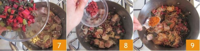 Ajoutez les herbes 7, puis assaisonnez avec le concentré de tomate 8 et le piment 9.