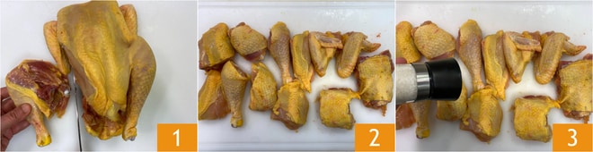 Pour préparer le ragoût de poulet aux marrons et aux champignons, commencez par découper le poulet en morceaux 1 2, puis salez la viande 3.