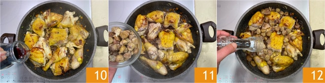 Déglacez avec le vin rouge 10 et laissez s'évaporer l'alcool pendant 2-3 minutes, puis ajoutez les marrons 11. Assaisonnez de sel et de poivre 12 et mélangez.