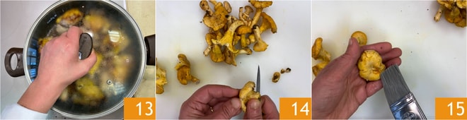 Couvrez avec un couvercle 13 et laissez cuire à feu doux pendant 40-50 minutes. Pendant ce temps, nettoyez les girolles en retirant la partie finale du pied 14, puis éliminez les résidus de terre avec un pinceau 15.