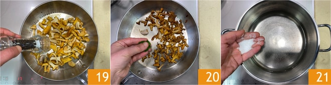 Ajoutez les girolles, salez et poivrez 19. Aromatisez avec le persil haché 20 et faites sauter quelques minutes à feu vif. Gardez-les au chaud ou ajoutez-les au poulet. Occupez-vous maintenant de la préparation de la polenta : dans une casserole, versez l'eau, ajoutez le sel 21 et portez à ébullition.