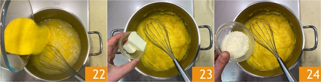 Versez la farine de maïs en mélangeant avec un fouet pour éviter les grumeaux 22. Faites cuire pendant 30-40 minutes en remuant continuellement, jusqu'à ce que la polenta se détache des bords de la casserole. Éteignez le feu et incorporez le beurre 23 et le Parmigiano Reggiano DOP râpé 24.