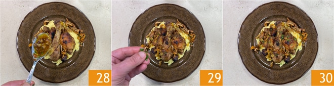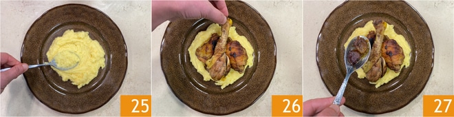 Servez en répartissant la polenta au fond 25, placez le poulet dessus 26 et ajoutez les marrons 27.