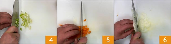 Coupez le céleri en dés 4, puis épluchez les carottes et réduisez-les également en dés 5. Émincez aussi l'oignon 6.