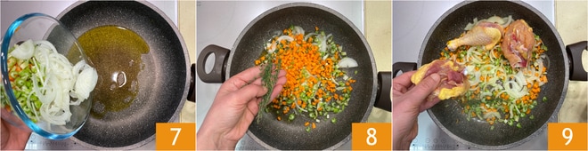 Dans une grande casserole, chauffez l'huile à feu moyen-doux, puis ajoutez les légumes 7, le thym 8 et les morceaux de poulet 9. Faites dorer la viande de tous les côtés.