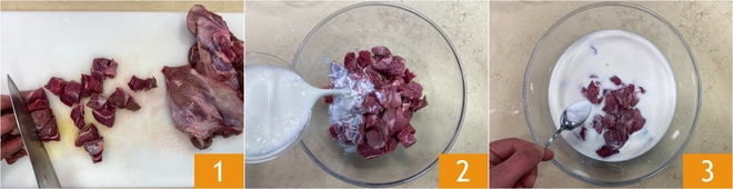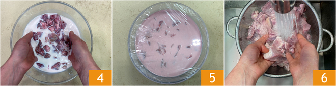 Pour préparer le ragoût de sanglier avec polenta taragna, commencez par couper la chair de sanglier en cubes d'environ 3 cm 1. Transférez-les dans un bol, versez le lait 2 et ajoutez le bicarbonate 3 ; assurez-vous que la viande est complètement couverte par le liquide.