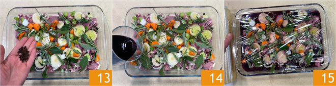 Ajoutez aussi les clous de girofle 13, puis versez le vin rouge 14 et couvrez de film plastique 15. Mettez à mariner au réfrigérateur pendant 24 heures supplémentaires.