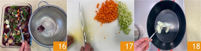 Passé ce temps, préparez le bouillon de légumes et gardez-le au chaud. Ensuite, retirez la viande de la marinade, laissez-la égoutter dans une passoire 16 et éliminez les légumes. Nettoyez et coupez en mirepoix la carotte et le céleri, puis émincez finement l'oignon vert 17. Dans une cocotte en fonte, faites fondre doucement le saindoux avec le beurre 18.