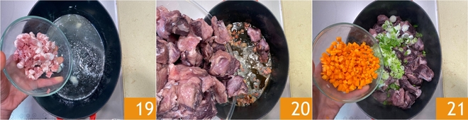 Ajoutez la pancetta piacentina hachée 19 et faites-la revenir brièvement à feu vif, puis ajoutez la chair de sanglier 20 et faites-la bien dorer pendant quelques minutes. À ce stade, ajoutez les légumes 21.
