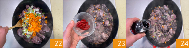 Faites revenir pendant quelques minutes 22, puis assaisonnez avec le concentré de tomate 23 et mélangez pour amalgamer. Déglacez avec le vin rouge 24 et laissez évaporer complètement la partie alcoolique.