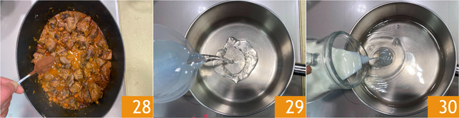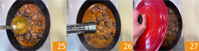 Couvrez avec le bouillon de légumes 25, ajustez le sel et le poivre 26, couvrez avec le couvercle 27 et laissez cuire à feu doux pendant 2 heures et demie.