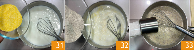 À la fin de la cuisson, éteignez le feu et complétez avec le cacao amer 28, en mélangeant bien pour amalgamer. Occupez-vous de la polenta taragna : dans une petite casserole, versez l'eau 29 et le lait 30, puis portez à ébullition.