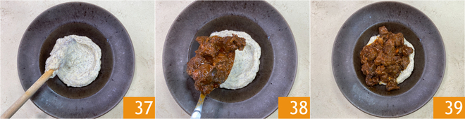 Vous êtes prêt à dresser : répartissez la polenta dans l'assiette 37 et disposez les morceaux de viande par-dessus 38. Votre ragoût de sanglier avec polenta taragna est prêt à être servi 39 !
