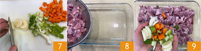 Réservez temporairement la viande dans la passoire et préparez la deuxième marinade : nettoyez et coupez grossièrement la carotte, le céleri, l'oignon vert et le poireau 7. Transférez la chair de sanglier dans un récipient bas et large 8, puis répartissez les légumes par-dessus 9.